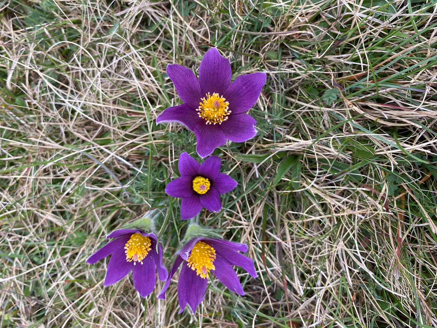 When my dog lags behind me on a walk I walk backwards until she catches up. Love pasque flowers.